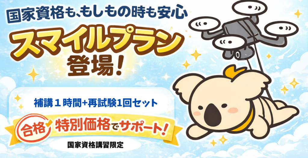 ドローン教習所愛知三河校では、国家資格講習をご受講いただく皆さまが、より安心して技能試験に臨めるよう、安心サポートオプション「スマイルプラン」および「スマイル+(プラス)プラン」をご用意しております。